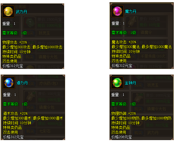 3、武力丹,魔力丹,道力丹,金钟丹,铁布丹的属性修改