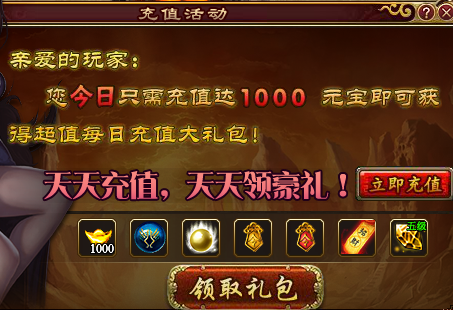 玩家只需在游戏当天累计充值达到一定金额,即可在游戏中领取对应的超值充值大礼包!