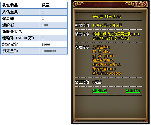 活动内容:活动时间内充值只需达到10000元宝即可领取以下礼包!