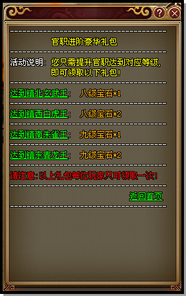 活动说明:活动期间提升到对应等级官阶将会获得豪礼礼包一份