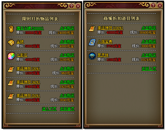 活动说明:在限定时间内部分商城物品或非商城物品打折出售机会不多,赶紧购买吧!