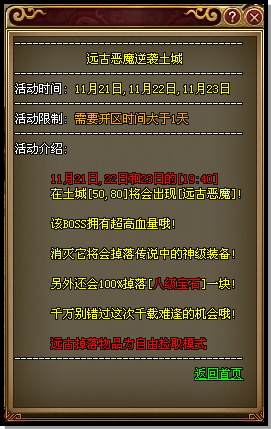 活动介绍:活动期间,在土城【50,80】将会出现【远古恶魔】!消灭它将会掉落传说中的神级装备!另外还会100%掉落八级宝石一块!千万别错过这次千载难逢的机会哦!