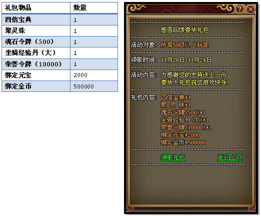 礼包内容:四倍宝典*1、聚灵珠*1、魂石令牌(500)*1、坐骑经验丹(大)*1、荣誉令牌(10000)*1、绑定元宝*2000、绑定金币*500000