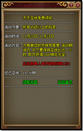 活动内容:为感谢广大玩家对《武尊》游戏的支持和厚爱,活动期间内,您只要保持在线长达一小时,即可获得1000绑定元宝!