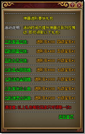 活动说明:活动期间提升神器达到对应等级,即可领取以下豪华礼包