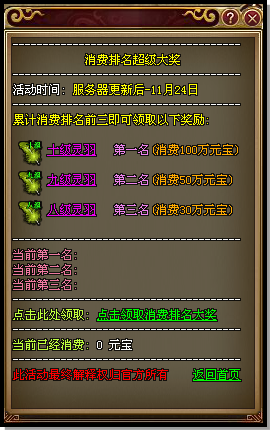 活动奖励:第一名:十级灵羽(需要消费达到100万元宝)