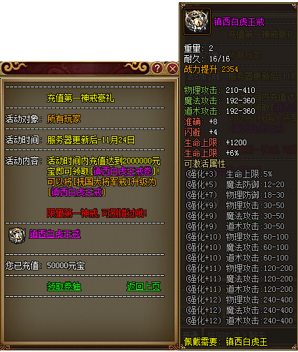 活动内容:十一月活动期间充值达到2000000元宝即可领取镇西白虎王戒卷,持此卷可以将[抚国大将军戒]升级为天下第一神戒:镇西白虎王戒!