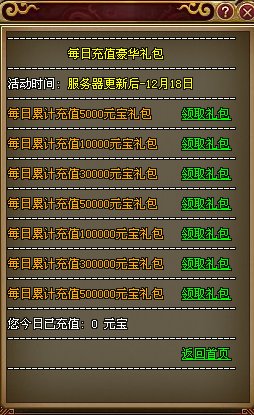 活动内容:活动时间内充值只需达到10000元宝即可领取以下礼包!