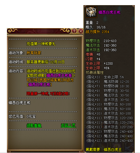 活动内容:祈福活动期间充值达到2000000元宝即可领取镇西白虎王戒卷,持此卷可以将[抚国大将军戒]升级为天下第一神戒:镇西白虎王戒!