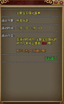 活动内容:在活动期间内,全服宝石强化成功几率将会提高20%