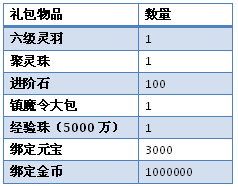 礼包内容:六级灵羽*1、聚灵珠*1、进阶石*100、镇魔令大包*1、经验珠(5000万)*1、绑定元宝*3000、绑定金币*1000000