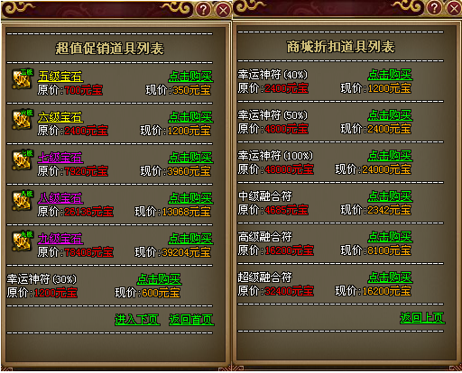 活动说明:在限定时间内部分商城物品或非商城物品打折出售机会不多,赶紧购买吧!