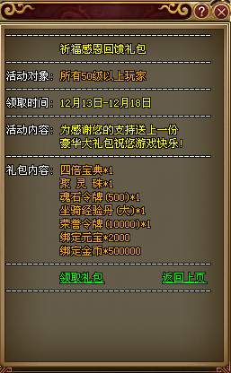 活动内容:祈福活动时间内,充值到指定的金额,即可获得一份丰厚的礼包!