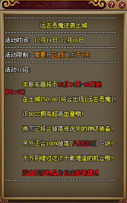 活动内容:祈福活动指定时间内将会在“土城”坐标【50.80】出现【远古恶魔】!击杀后100%掉落传说中的 “神级装备”以及“高级宝石”。