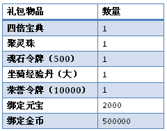 礼包内容:四倍宝典*1、聚灵珠*1、魂石令牌(500)*1、坐骑经验丹(大)*1、荣誉令牌(10000)*1、绑定元宝*2000、绑定金币*500000