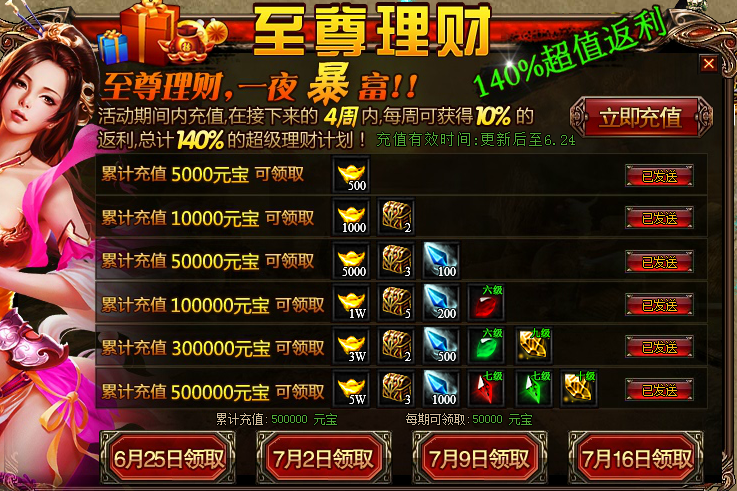 2. 活动期间内充值,每隔一周后,可以领取10%的返利,总计140%;