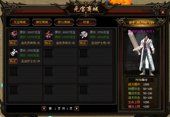 商城之内新开设了时装分页,玩家可在此处购买及试穿时装。鼠标点击时装图标,可在右侧试衣间展示时装外观及时装属性