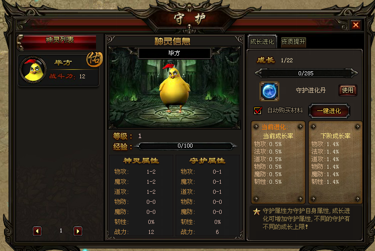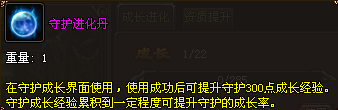 - 守护成长进化:守护使用守护进化丹,可提升守护成长等级,越高的成长等级对应越高的成长率,成长率影响守护每次升级时增加的属性。