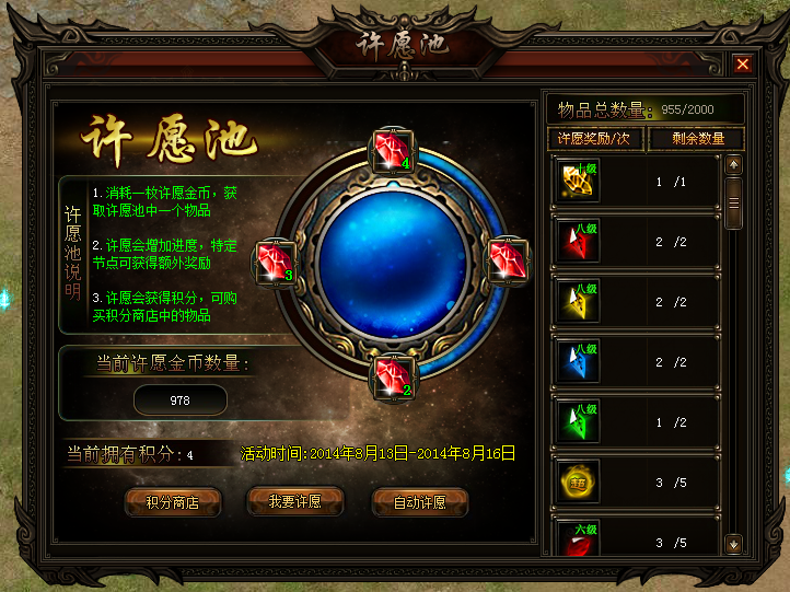 3. 每次使用许愿金币,可获得许愿积分,用于在积分商店中购买道具。
