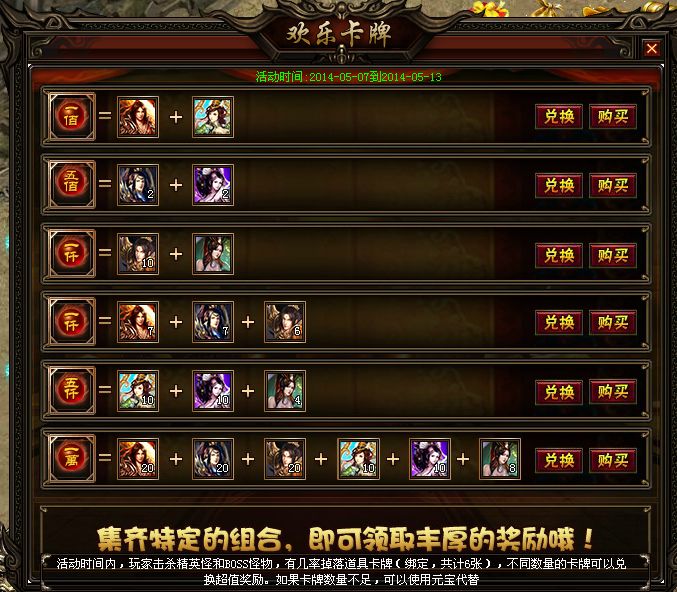 活动内容:活动时间内,玩家击杀精英怪和BOSS怪物,有几率掉落卡牌(绑定,共计6张),不同数量的卡牌可以兑换超值奖励。如果卡牌数量不足,可以使用元宝代替。