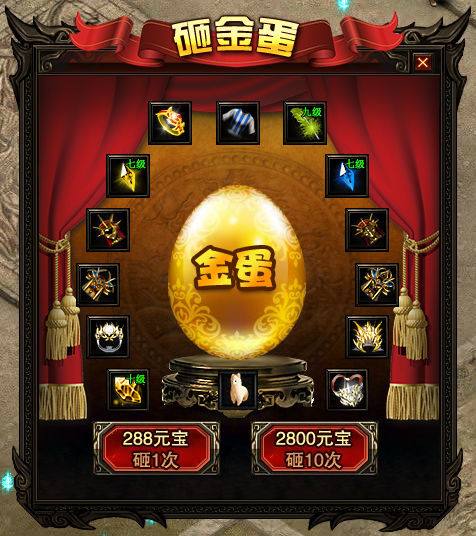 1.玩家花费288元宝可以砸金蛋1次,随机获得奖励物品。