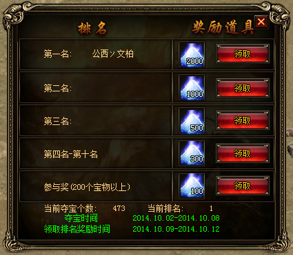 排行榜将显示本服玩家获得宝物总数的排行,夺宝个数大于及等于200个的玩家才会上榜,上榜后可以看到自己的当前排名。上榜的玩家可以于9~12日领取奖励,奖励为升级护符所需的[星尘]。