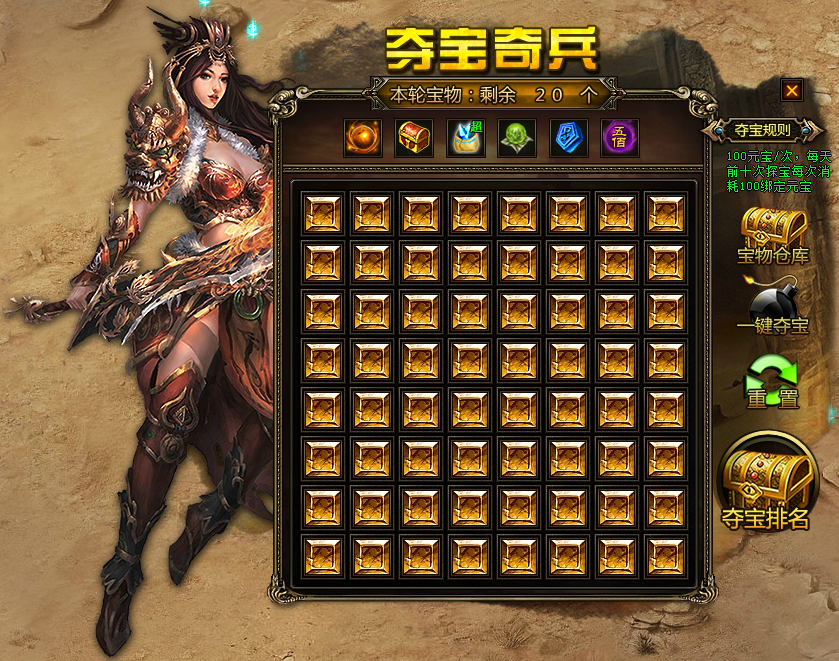 2. 每轮夺宝会有20个宝物随机分布在游戏面板的64个格子中,玩家可以点击“重置”按钮来重置本轮所有格子并刷新奖励物品。