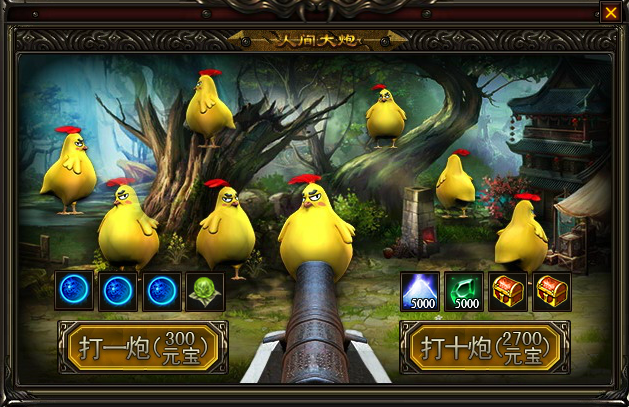 l 玩家花费300元宝,点击“打一炮”按钮,可开炮打火鸡,必定掉落一件道具;