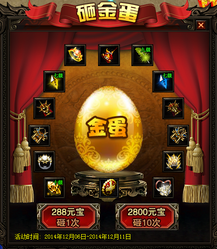 1.玩家花费288元宝可以砸金蛋1次,随机获得奖励物品。