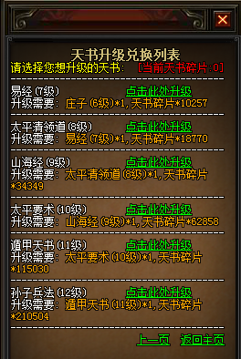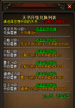 点击“兑换天书”即可进入对应的道具兑换列表: