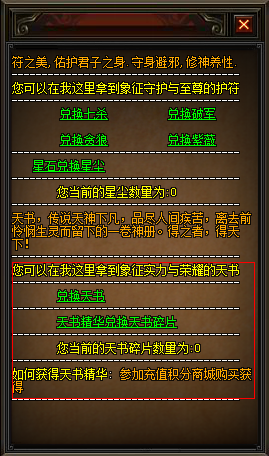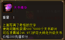 玩家可在商城内[积分商城]中使用充值积分兑换天书精华,每200充值积分可兑换1个天书精华。