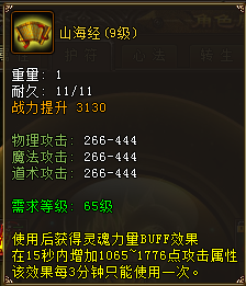 使用后获得"灵魂力量"BUFF效果,在15秒内增加人物1065~1776点物攻、魔防和道攻,每3分钟只能使用一次。 |