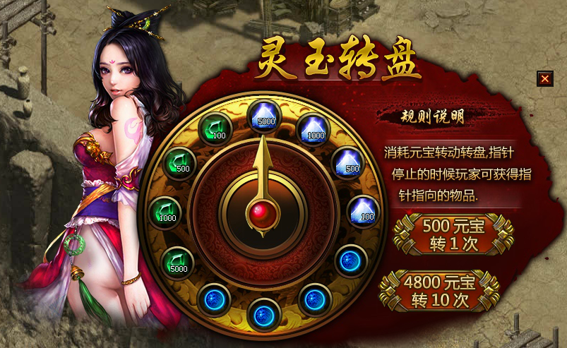 1.玩家花费500元宝可以转1次,随机获得奖励物品。