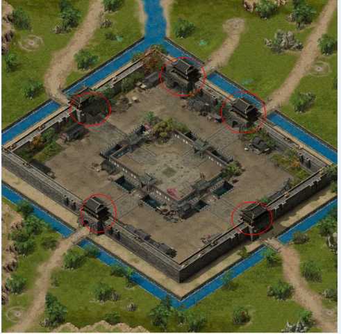 3.1 各行会玩家跨服进入异界地图后,每个行会的成员随机出生在上图红圈所示的安全区内(每个行会固定1个安全区);