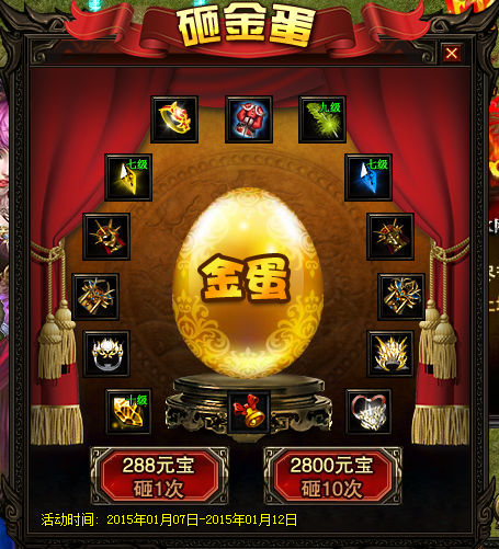 1.玩家花费288元宝可以砸金蛋1次,随机获得奖励物品。