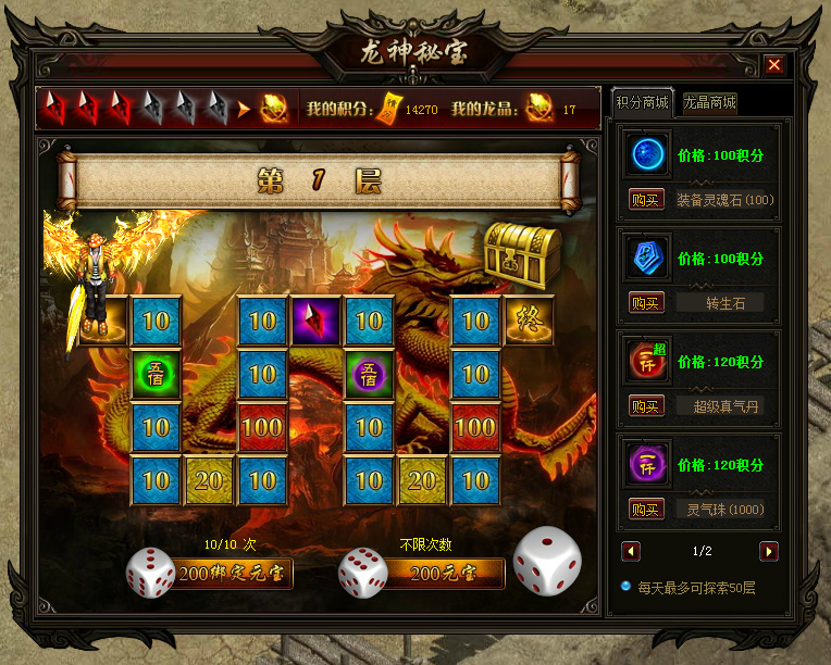 商店分为积分商店及龙晶商店,消耗对应的代币获得物品。