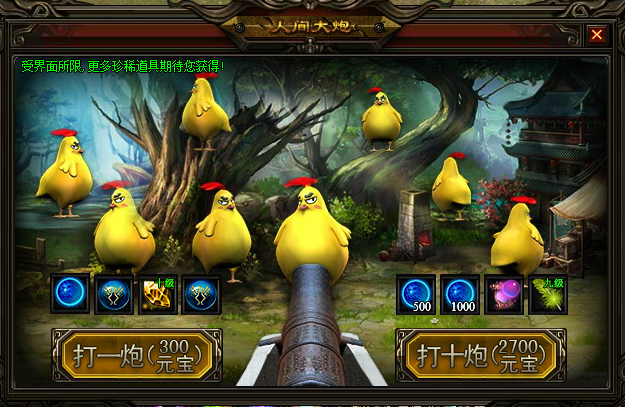 玩家花费300元宝,点击“打一炮”按钮,可开炮打火鸡,必定掉落一件道具;