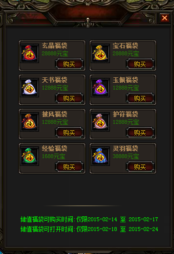 2.储值福袋可购买时间为2015年2月14日更新后-2015年2月17日