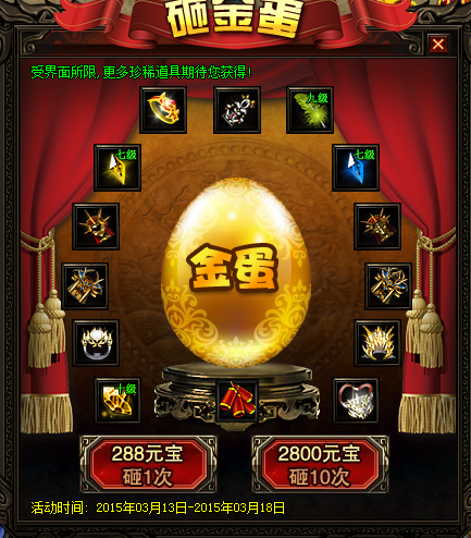 1.玩家花费288元宝可以砸金蛋1次,随机获得奖励物品。