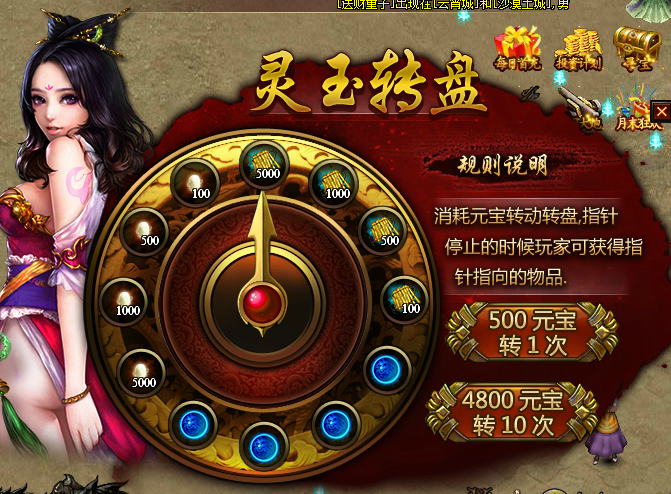 1.玩家花费500元宝可以转1次,随机获得奖励物品。