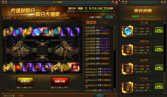玩家每进行充值10RMB就会获得10积分,积分可在积分抽奖中抽取相应物品,会上架一些超值的道具供玩家限时元宝兑换