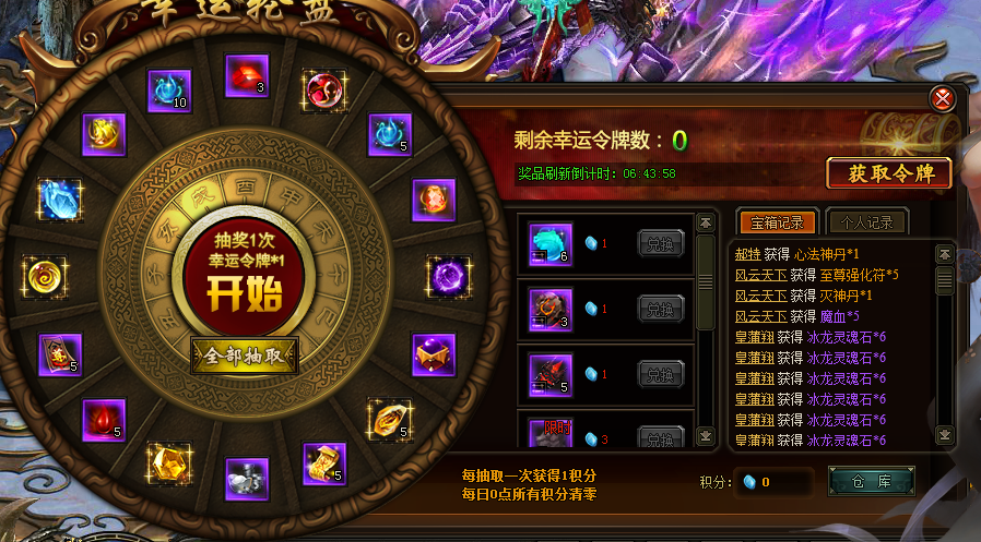 【活动内容】活动期间,凡充值即可领取幸运令牌以及积分,幸运令牌可进行抽奖,积分可用来兑换奖励。