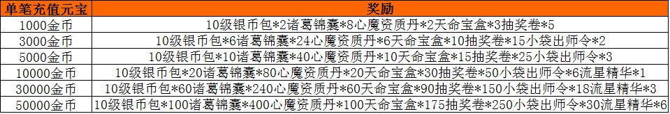 活动内容:活动期间,游戏内开启单笔充值活动,玩家每单笔充值一定金额,即可获得奖励。