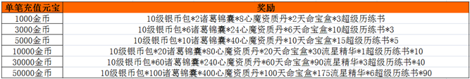 活动内容:活动期间,游戏内开启单笔充值活动,玩家每单笔充值一定金额,即可获得相应的充值奖励。