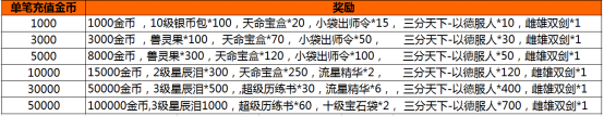 活动内容:活动期间,游戏内开启单笔充值活动,玩家每单笔充值一定金额,即可获得相应的充值奖励。