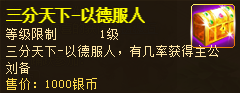 2、 单笔充值1000金币以上获得的雌雄双剑可以开启活动使者隐藏选项:20金币/个的价格购买三分天下-以德服人。