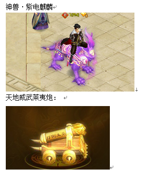 活动奖励:绝版坐骑:神兽·紫电麒麟、天地威武莱夷炮、时装时效卡、流星精华、各类出师令袋、各类魂气包、各级宝石袋、各级星辰泪、天命宝盒、经验珠等。