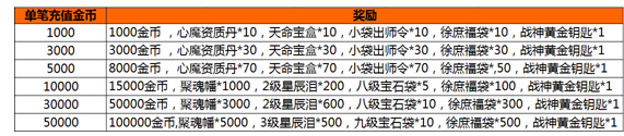 活动内容:活动期间,游戏内开启单笔充值活动,玩家每单笔充值一定金额,即可获得相应的充值奖励。拥有战神黄金钥匙,可以前往活动使者直接购买徐庶礼包。