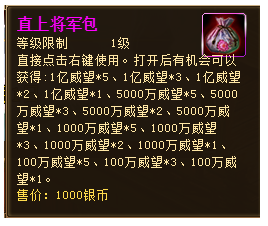 活动奖励:直上将军包,大量银币,聚魂幡,铸魂石,超级历练书,天命宝盒,出师令!