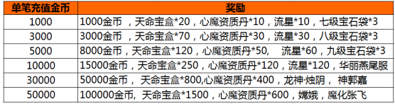 活动内容:活动期间,游戏内开启单笔充值活动,玩家每单笔充值一定金额,即可获得相应的充值奖励。
